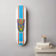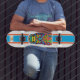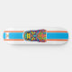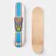 Skateboard mit farbenprächtigen polynesischen Tiki-Kopfdesign über blauen und orangefarbenen Rennstreifen.