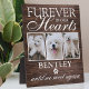 Plaque de photo de mémorial d'animal de compagnie rustique avec un fond à effet bois, 3 photographies de votre chien ou chat bien-aimé, la phrase "à tout jamais dans nos cœurs", le nom de votre animal de compagnie, une empreinte de patte blanche et la phrase de sympathie "jusqu'à ce que nous nous retrouvions".