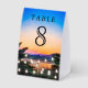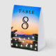 Elegant table number card featuring modern typography against a romantic sunset background.