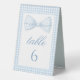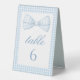 Élégant classique preppy baby boy numéro de table de douche sur le panneau de tente de table montrant mignon bébé bleu arc cravate dans en vichy motif.
