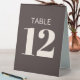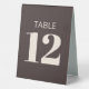 This wedding table tent in brown features bold, modern typography on a rich neutral background for clear, at-a-glance table identification. The folded, self-standing format sits neatly on reception tables and works well for weddings, rehearsal dinners, and formal celebrations. A simple, polished choice that pairs easily with modern stationery, signage, and place settings.