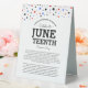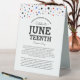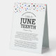 Célébrez la fête du 11 juin ! Ces tentes de table ont un design minimaliste mais significatif sur le thème de la junte. Au sommet se trouve un amas d'étoiles représentant les États-Unis. Au lieu de cela, ces étoiles sont dans une palette de couleurs rouge, noir et bleu. En-dessous, vous trouverez votre message unique sur ce que signifie pour vous le 19ème jour férié. Un excellent outil éducatif pour enseigner aux gens plus sur la fête du 18 juin.