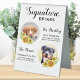 Signature Boissons de vos animaux de compagnie! Inclure votre meilleur chien, meilleur chat et tout animal de compagnie dans votre mariage avec son bar à boissons signature pour vos invités. Parfait pour les amoureux de les chiens, et un bar spécial chien sera un succès à votre mariage. Blanc simple mais élégant avec cadre fleuri de tournesol. Customisez ce signe mariage animal de compagnie avec votre chien, chat, chiot ou chaton photos préférées, noms et boissons signature!. DROIT D'AUTEUR © 2020 Judy Burrows, Black Dog Art - Tous droits réservés. Signature personnalisée Boissons Sunflower Pet Mariage Table Tente Signet