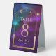 Cosmic Purple Turquoise Gold Sun Lune Astronomie Mariage Numéros Tableau Tente Signal présente soleil doré, lune et étoiles avec un cadre doré sur coloré mystique violet, turquoise et bleu arrière - plan cosmique. À l'intérieur, il y a vos informations de numéro de table personnalisées. Conçu pour vous par Evco Studio www.zazzle.com/store/evcostudio