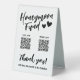 Tente de table romantique signe de fonds de lune de miel mariage avec une combinaison d'un script d'écriture de charme et d'une sans serif moderne, personnalisée avec deux codes QR et vos noms, et avec deux coeurs mignons. Le code QR signe de fonds lune de miel avec deux coeurs et vos noms.