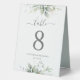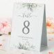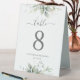 De beaux numéros de table mariage avec des eucalyptus aquarelles et des feuilles d'or.