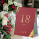 Antique et élégant rouge et or mariage de table numéro de la marque de tente dispose d'une belle typographie vintage monogramme design. Le texte et le numéro de table personnalisés peuvent être personnalisés avec les noms de la mariée et du marié. Notez que chaque carte de numéro de table doit être customisée et ajoutée individuellement au panier (1,2,3...etc.).