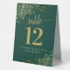 Ces magnifiques panneaux de tentes de table faciliteront la recherche de tables à votre réception de mariage. L'élégant design vert émeraude et or présente une calligraphie en dentelle avec des boucles florales ornées et des tourbillons dans les coins. Il y a de la place pour les noms du couple et la date du mariage.