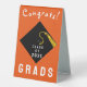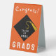Décor de table créative de fête de graduation avec capuchon de graduation noir et or sur arrière - plan orange. Modifier le texte pour ajouter l'année ou une autre personnaliser pour les diplômés.