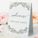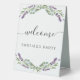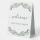 Un signe de bienvenue pour une fête. Un arrière - plan blanc, décoré de lavande, de fleurs et de verdure d'eucalyptus. Personnalisez et ajoutez votre nom. Lettres noires.