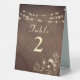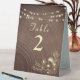 Élégant, boho moderne, botanique, rustique numéro de table de mariage en bois, avec dentelle fleurie or et lampes à cordes.