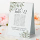 Ces magnifiques panneaux de tentes de numéro de table comprennent un tableau ou une liste de dix noms pour aider vos invités à trouver la table correcte à votre réception de mariage. L'aquarelle rustique peinte à la main présente des sprigs de feuilles d'eucalyptus et de la verdure dans les tons menthe, mousse et vert sauge. Le titre est écrit en calligraphie script élégante avec la place pour les noms de couple et mariage date ci-dessous.