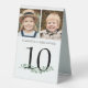 Panneau de tente avec 2 photos de la mariée et du marié au fil des ans pour divertir les invités. Numéro de table mariage personnalisé. Amusant d'avoir des photos d'âge similaires sur le même panneau et des photos différentes sur chaque table que les invités se mélangent. Imprimé sur les deux côtés pour un affichage recto verso. CHANGEMENTS : La couleur du texte noir peut être modifiée pour correspondre à votre jeu de couleurs et la verdure peut être supprimée si vous ne le souhaitez pas. CONSEIL PHOTO : Choisissez des photos avec le sujet au milieu et/ou pré-rognage dans une forme similaire AVANT de télécharger et d'utiliser l'outil CROP pour ajuster l'image dans la zone modèle. ASSISTANCE : Pour obtenir de l'aide sur la modification ou la personnalisation de la conception, le changement de couleur, le redimensionnement ou le transfert de la conception à un autre produit, contactez le concepteur AVANT DE COMMANDER via l'onglet MESSAGE Conversation Zazzle ci-dessous ou envoyez un courriel à makeitaboutyoustore@gmail.com.