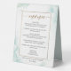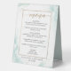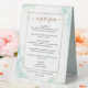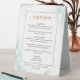 Elégant panneau de tente Menu avec de délicates taches d'aquarelle dans un mélange de teintes turquoise, aqua, bleu poussiéreux et vert pâle. Personnalisez avec votre propre menu, nom(s) et date. Cadre doré, typographie, feuillage et taches de nausée. Possibilité de modifier la taille du texte, le style et la position en sélectionnant la personnaliser plus loin. Détails de calligraphie manuscrite moderne. Une partie de notre collection "Airy Blue and Green Watercolor" avec une variété de produits de coordination disponibles.