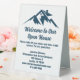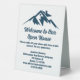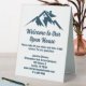 Un panneau de table de la chaîne de montagnes cool pour une entreprise immobilière située dans une ville ou une ville montagneuse. Le nom du royaume est écrit en écriture bleu marine sous la maison au milieu des montagnes. Excellent article de marketing pour un constructeur de maisons en montagne.