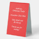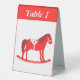 Ce magnifique panneau de tente de table de Noël présente une image art numérique d'un mignon cheval à bascule de style scandinave. Le cheval est rouge avec une crinière rouge foncé, la queue et les sabots. Le cheval sympathique sourit. Il a une selle blanche et des rois avec de jolis motifs de style Scandi rouge sur la selle, y compris le soleil, la lune et les étoiles, les coeurs et les fleurs. La base du cheval rocking est rouge et est couverte de feuilles blancs. Le design a été inspiré par le cheval suédois Dala. Il y a du texte personnalisé à l'arrière pour que vous puissiez inclure votre propre message.