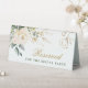 Élégante carte de table avec une illustration de roses blanches, feuillage de verdure et fleurs dorées dans le style aquarelle.