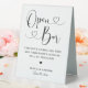 L'enseigne mariage à tentes Open Bar présente un script de calligraphie moderne avec des accents cardiaques, jumelé avec une citation personnalisée et un monogramme des noms de la mariée et du marié et de la date du mariage. Les couleurs noir et blanc peuvent être modifiées.