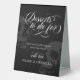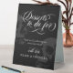 Elégant signe de table de desserts mariage d'Halloween ou goth avec un script tourbillonnant de calligraphie blanche, un arrière - plan noir et des crânes gris foncé. Décorez votre table de desserts mariage goth avec ces desserts à mourir pour le panneau de table personnalisée avec vos noms et un modèle goth cool dans des couleurs sombres avec des crânes.