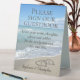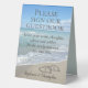 Veuillez signer notre panneau du livre d'or ! Signez pour demander aux invités mariages de laisser leur nom, leurs pensées, leurs conseils et leurs souhaits pour M. et Mme nouvellement mariés dans le livre d'or. Coeurs pittoresques dans l'image de plage de sable, pour des visions de relaxation dans le paradis, célébrer votre mariage de plage avec ce design charmant. Deux coeurs enchevêtrés tirés dans le sable de plage sur la côte océanique, parfait pour une destination, île, paradis tropical événement nautique côtier. Sable bleu turquoise et bronzé avec vagues blanches qui s'écrasent sur le rivage.