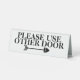 Idéal pour toute entreprise ou boutique. Un arrière - plan blanc a une police noire en gras qui dit "S'il vous plaît utilisez une autre porte" avec la silhouette d'une flèche pointant dans la direction à suivre. Personnalisez le libellé à n'importe quel de votre choix et n'hésitez pas à ajouter une couleur arrière - plan et à modifier la couleur, le style et la taille de la police en fonction de vos besoins professionnels.
