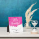 Plaque de bureau avec les mots "Hello Beautiful" écrit dans une police manuscrite tendance. Ci-dessous est une police simple qui dit : faites aujourd'hui un fabuleux, avec un florissement décoratif au fond. Un design mignon avec un éclat de peinture d'aquarelle rose vif.