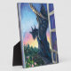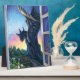 Gargoyle Guardian Art de Traci Van Wagoner imprime, affiche, accessoires et cadeaux une gargouille en pierre bleue et grise qui vous regarde de sa perche au-dessus de la ville tôt le matin avec un ciel de soleil levant texturé de jaune, orange, rose, violet et bleu. Obtenez-vous un gardien de gargoyle aujourd'hui pour garder une attention pour vous.
