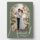 Un garde spécial vous propose votre photo mariage dans un design élégant en arc avec le texte "Marié" dans le texte chic avec vos noms et date mariage sur un arrière - plan vert sage. Un beau cadeau pour votre famille et un souvenir fabuleux à présenter dans votre propre maison. La couleur ARRIÈRE - PLAN peut être changée ! PLUS DE COULEURS dans notre collection.