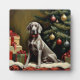 Chien Weimaraner célébrant Noël, sapin de Noël et cadeaux colorés.