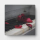 Artistic looking photo of old piano focusing on the old yellowing keys with a faded red rose sitting on the keys and a few loose petals scattered about. This image has a somewhat melancholy and sentimental mood with a little bit of a nostalgic feel.