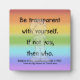 Un petit garçon transparent est debout avec les paroles de David A. Carrizales vu en face de lui avec un arrière - plan de couleur arc-en-ciel. La citation nous rappelle l'importance d'être transparents avec ceux qui nous entourent ainsi qu'avec nous-mêmes. Image de Christie Black de Creations from the Heart.
