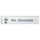 Plaque signalétique du bureau du maître d'école élégant faite dans le blanc, avec des graphiques d'un globe du monde de bureau, de l'aile gauche. Personnalisez le texte bleu pour lire ce que vous voulez. Fait une grande idée de cadeau.