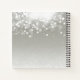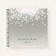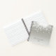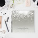 Das elegante Notebook ist mit einem silbergrauen Hintergrund versehen, der mit einem weißen Bugglühen an der Spitze geschmückt ist. Personalisieren Sie mit zwei Textzeilen am unteren Rand in klassischer schwarzer Schrift.