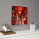 Drei rot und silber gestreifte Kerzen auf einem weihnachtroten Hintergrund mit goldfarbenen Zahlen.
