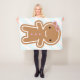 Ein glückliches Lebkuchenplätzchen mit weißer Zuckerglasur, Gumdropknöpfe und ein rosa Haar beugen auf einem stripy Hintergrund. Groß für Weihnachten.