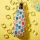 Diese Flasche cooler hat ein geometrisches Design von Quadraten in Mandarine, Mohn, Korallen, und Schattierungen von aquamarinen mit ihren Konturen verstreut.