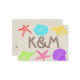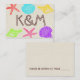 Die Platzkarten sind mit Seestern, Kamelen und Zapfen in Rot, Blau, Gelb, Grün, Rosa und lila, mit braunem Beispieltext auf einem Leinwand-Hintergrund.