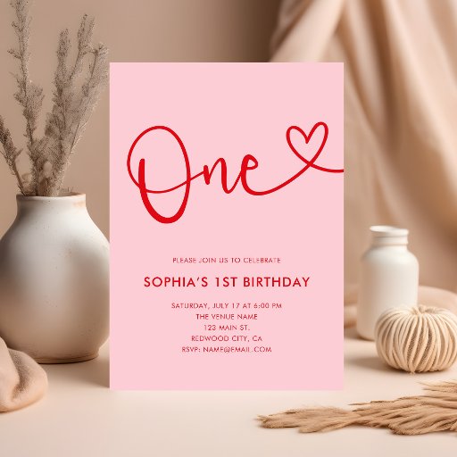 The invitation is a testament to clean aesthetics, showcasing a serene background in shades of soft pink and gentle red. Front and center, the word "One" takes center stage, crafted in a playful script calligraphy that exudes youthful charm. The letters dance and swirl with joy, reflecting the innocence of early childhood. Adjacent to the word, a delightful heart with a graceful swirl adds an endearing touch, symbolizing the love that envelops the young celebrant on this special day.