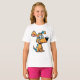 The dog's fur is primarily a bright orange-yellow, with distinct blue spots on its body, ear, and tail. One ear stands upright and is a mix of orange-yellow and blue, while the other is floppy and orange-yellow. Its tail is short and curled, also featuring a blue tip. The lines defining the dog are bold and black, giving it a classic cartoon outline.
