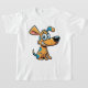This is a unique, cartoony illustration of a dog, designed to be suitable for apparel like T-shirts or hoodies. The dog has a playful and exaggerated expression, with wide, light blue eyes, prominent dark pupils, and a wide, toothy grin that shows off its white teeth. Its snout is long and black, adding to its whimsical appearance.