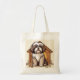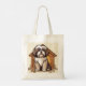 A beige tote bag featuring a cute brown‑and‑white Shih Tzu sitting in front of a wooden doghouse, with playful cartoon bones scattered around. The vibrant illustration pops beautifully against the neutral fabric.