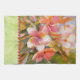 Décorez votre cuisine avec cette serviette de cuisine élégamment tropicale de 16 po x 24 po qui présente mon tableau à l'huile d'une grappe de fleurs de plumeria en roses rousses et oranges saumons. Les feuilles vert mousse lui donnent un aspect vintage et rétro vintage. La bordure est un lave à l'aquarelle vert doux avec un détail rouge et blanc.