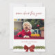 Faites-vous plaisir en cette période de fêtes grâce à notre carte de Noël "Plus de joie cette année" ! Ce design festif est parfait pour partager des souhaits chaleureux en famille et entre amis. Accentué par la verdure des vacances, un arc rouge, et le nom de famille et l'année personnalisée. Customisez avec votre propre image et texte pour faire une carte de vacances vraiment unique.
