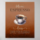 Cette affiche exquise capte l'essence de la joie et de l'énergie dans une simple tasse d'expresso. Au coeur se trouve une magnifique tasse d'espresso illustrée, reposant gracieusement sur sa soucoupe. L'espresso est représenté avec des détails complexes, montrant sa teinte profonde et riche et la couche crémeuse de crème à sa surface. Placé contre un arrière - plan brun texturé et chaud, le message "More ESPRESSO less DEPRESSO" attire l'attention. "More ESPRESSO" est écrit audacieusement dans une grande police invitante, tandis que "less DEPRESSO" est scénarisé avec un style fantaisiste et manuscrit. Dans l'ensemble, l'affiche rayonne de positivité et d'humour, suggérant que s'adonner à un peu plus d'expresso pourrait juste être le remède pour ces moments de sensation faible ou faible. C'est un rappel gai d'embrasser les plaisirs simples de la vie et de trouver le réconfort dans la chaleur d'une tasse d'expresso fraîchement brassée.