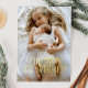 Elégante carte de faire-part bébé pendant les vacances avec une police typographique qui dit "plus le plus merrier" sur la photo de votre nouveau-né. Fonctionne mieux avec une image horizontale.