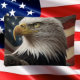 Aigle à tête blanche en alerte devant un drapeau américain agitant.