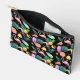Un oiseau toucan, un flamant rose et un ananas brillant se marient avec un cône de glace, des bars à crème glacée, une tranche de pamplemousse éclatante et un citron, avec des étoiles dorées et des feuilles de palmiers verts pour former un motif tropical amusant à l'avant de ce sac. Les images multicolores et lumineuses sont placées sur un arrière - plan noir dramatique. Votre monogramme à deux lettres est rose sur le dos, avec une image du flamant, de la feuille de palmier et de l'ananas. Lumineux, coloré et amusant !