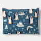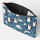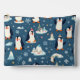 The image is a pattern of cute cartoon penguins on a blue background with snowflakes. The penguins are depicted in various poses: standing, waving, wearing hats and scarves, and interacting with winter elements like snowdrifts, Christmas trees, and igloos. The overall aesthetic is cheerful, festive, and child-friendly.