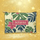 Un joyeux motif floral rouge et rose avec de grands feuilles de monstère verts et bleus contre un arrière - plan jaune doux.
