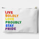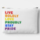 Live Boltly Love Fièrement Rester Fierté Accessoire Pouch Cosmetic Bag Design dans la typographie moderne qui dit "LIVE BOLDLY LOVE FIDLY STAY FIDE" dans un design minimaliste simple mais propre. Design simple dans les couleurs arc-en-ciel Pride qui fonctionne bien pour n'importe qui.